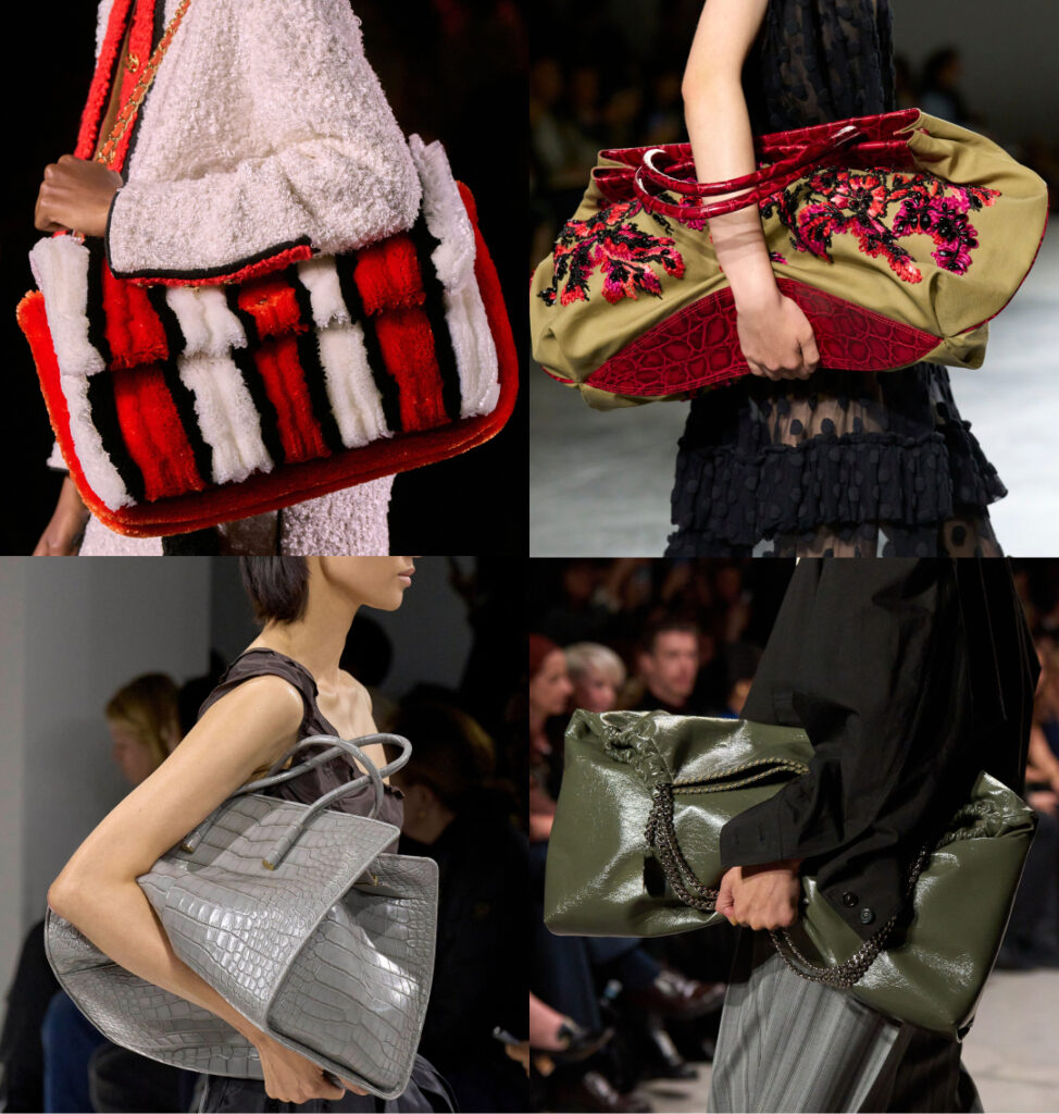Об’ємні торби, великі клатчі та м’які баули створюють образ, у якому є динаміка. Такі сумки підкреслюють характер і додають стилю сміливості.