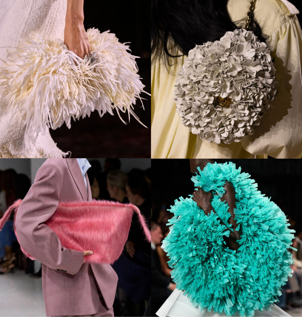 Пір’я, фактурні шкіряні пелюстки, пухнасті волокна й матеріали, що нагадують рослинні елементи, формують окрему категорію сумок сезону. Природні текстури додають руху, легкості та декоративної глибини.