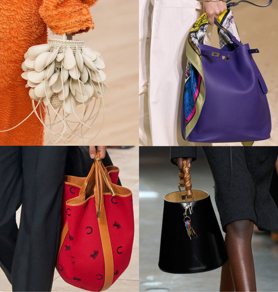 Бочонки повертаються в колекції різних брендів від компактних форм до великих, майже кошикових силуетів. Їхня естетика будується на вертикалі: витягнуті лінії, глибокі внутрішні об’єми, щільна структура або м’який текстиль.