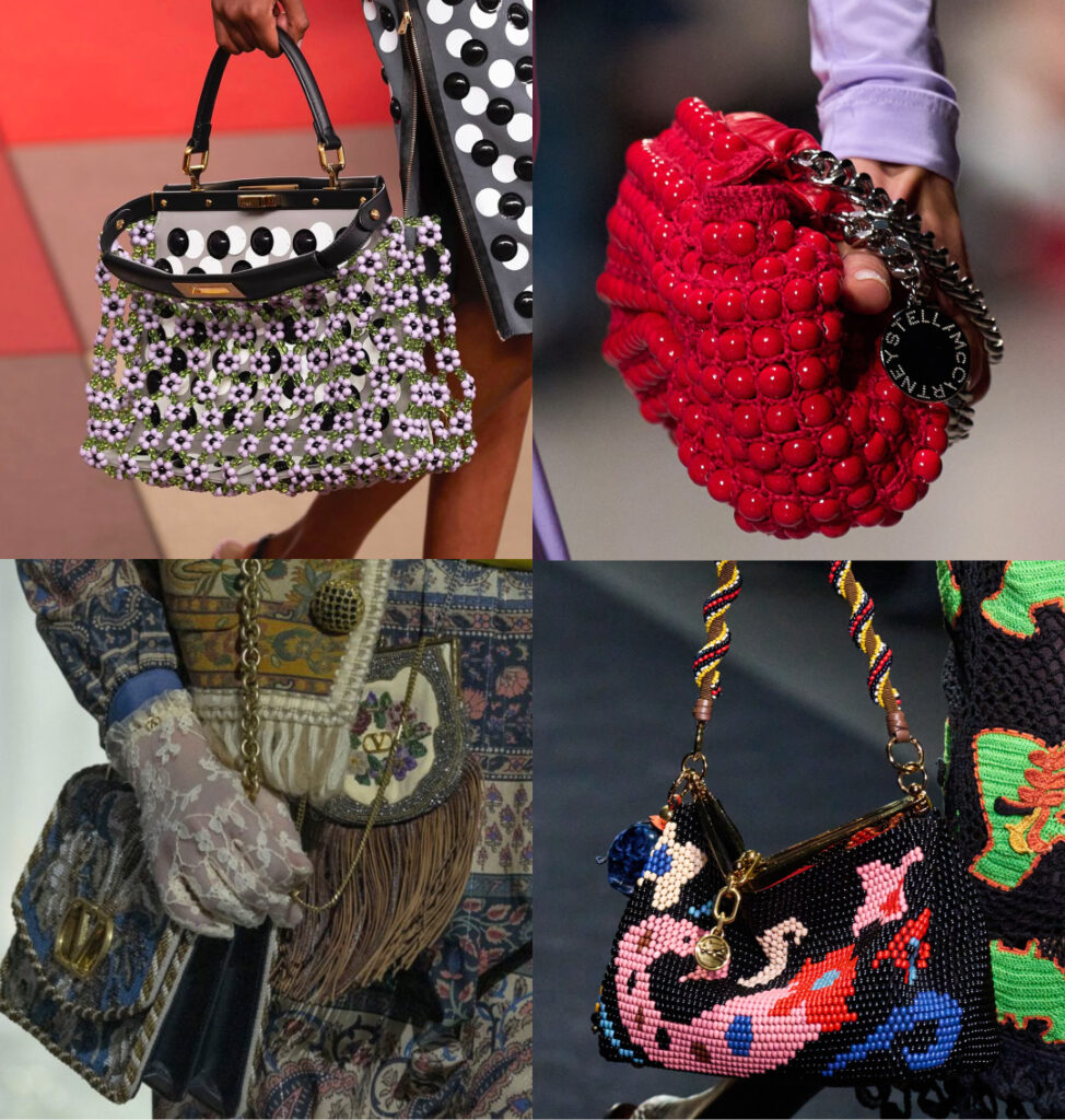 Бісер повертається у світ аксесуарів із новою виразністю. У 2026 році це повноцінні візерунки, об’ємні плетіння та фактурні нашивки, що створюють декоративну глибину.