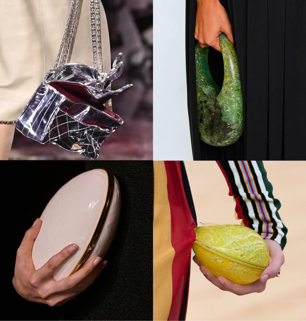 Окрема тенденція — сумки, що виглядають як об’єкти мистецтва: гладкі кам’яні форми, литі металеві контури, міні-скульптури. Це напрямок, що набирає обертів і створює нову категорію statement-аксесуарів.